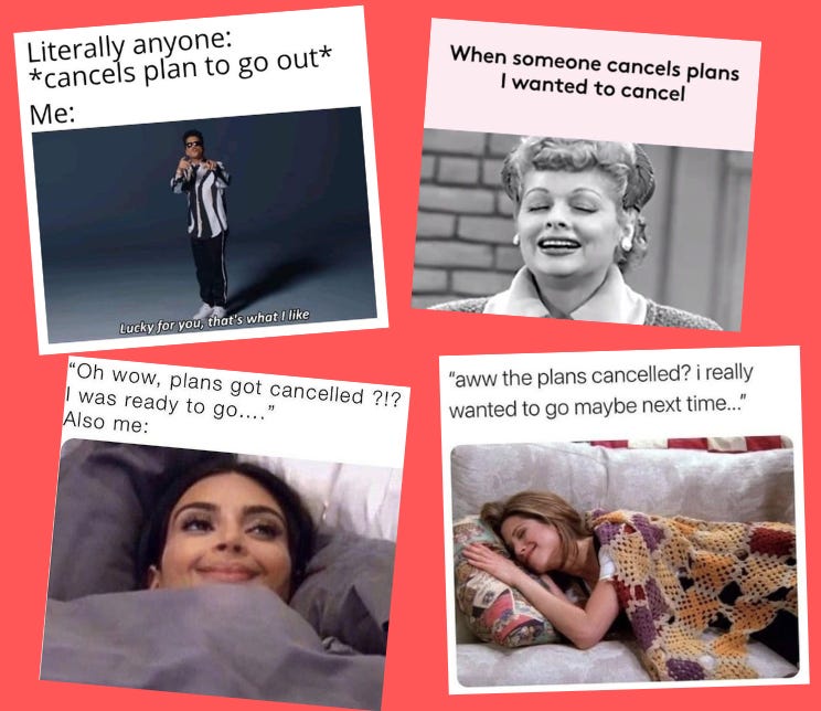 And the comforting resonance of cancelled-plan-smugness memes is also bittersweet: Why is this such a thing? What does it say about modern society that we’d rather not see our friends than see them?